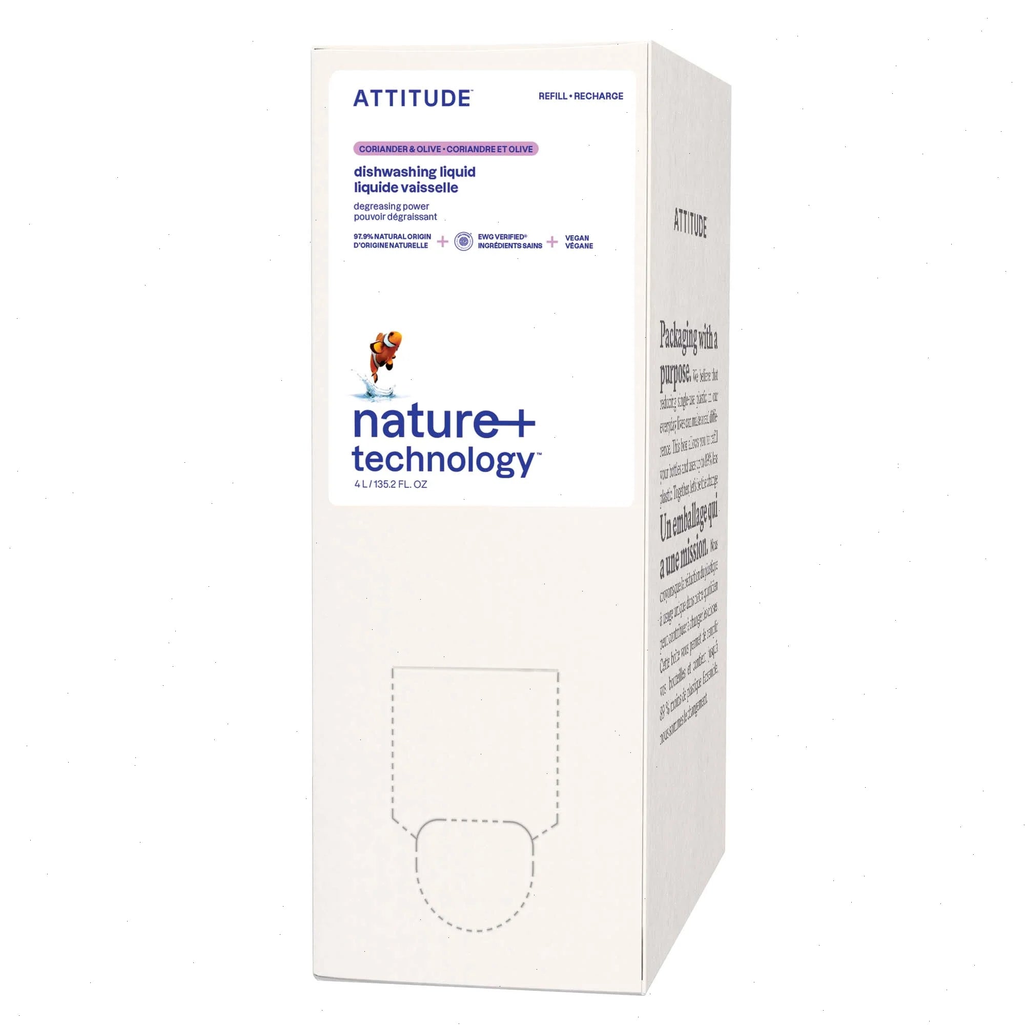 Formulated with 97% naturally derived ingredients, ATTITUDE™ dishwashing liquid with strong degreasing power is your new home essential. Its aromatic blend of coriander and olives evokes the scent of fresh herbs and creates a Mediterranean ambiance. Never run out of dishwashing liquid—keep refilling your bottle thanks to our innovative eco-refills. Its EWG VERIFIED™, vegan and cruelty-free formula leaves your dishes clean and sparkling every day.