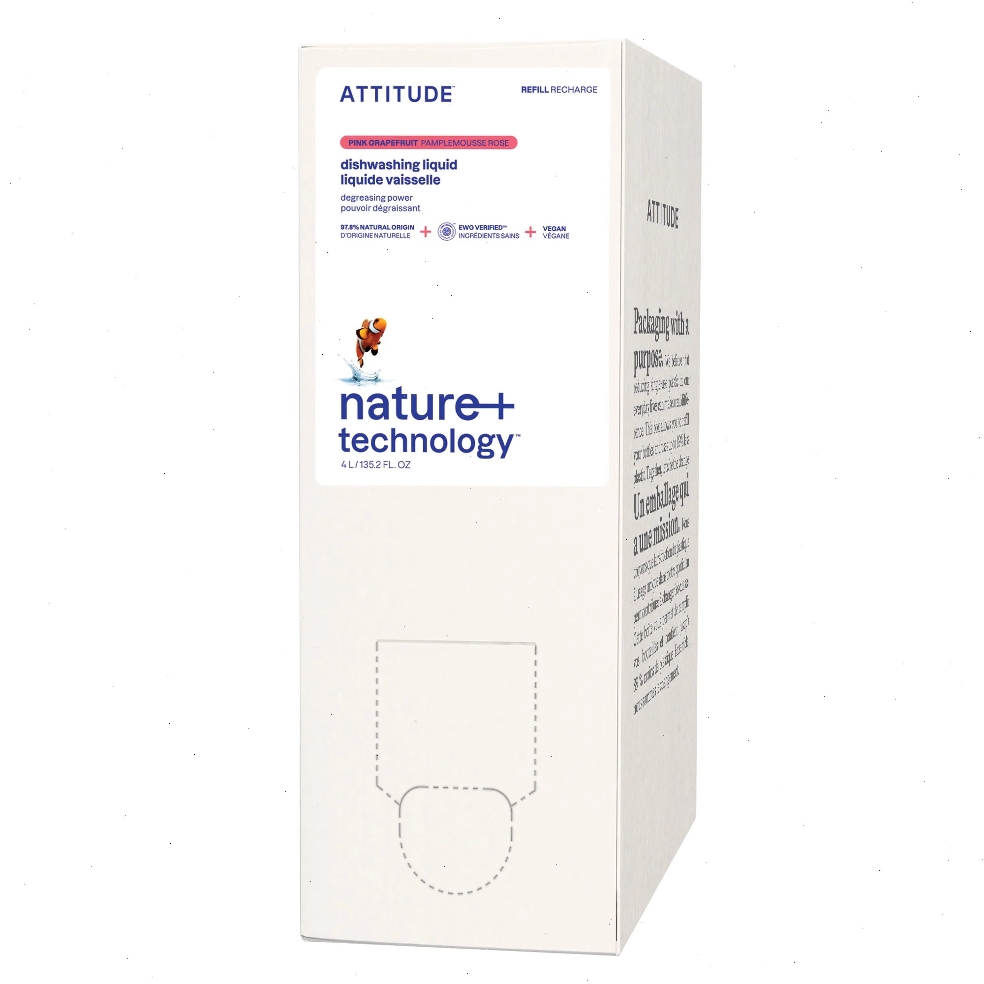 Formulated with 97% naturally derived ingredients,ATTITUDE™ dishwashing liquid with strong degreasing power is your new home essential. Its lively pink grapefruit notes blend harmoniously with the gentle floral tones of orange blossom. Its aromatic blend will give your kitchen a sunburst of energy. Its formula is completely vegan. This dishwashing liquid is offered in a 4 L eco-refill format that’s practical to use at home.