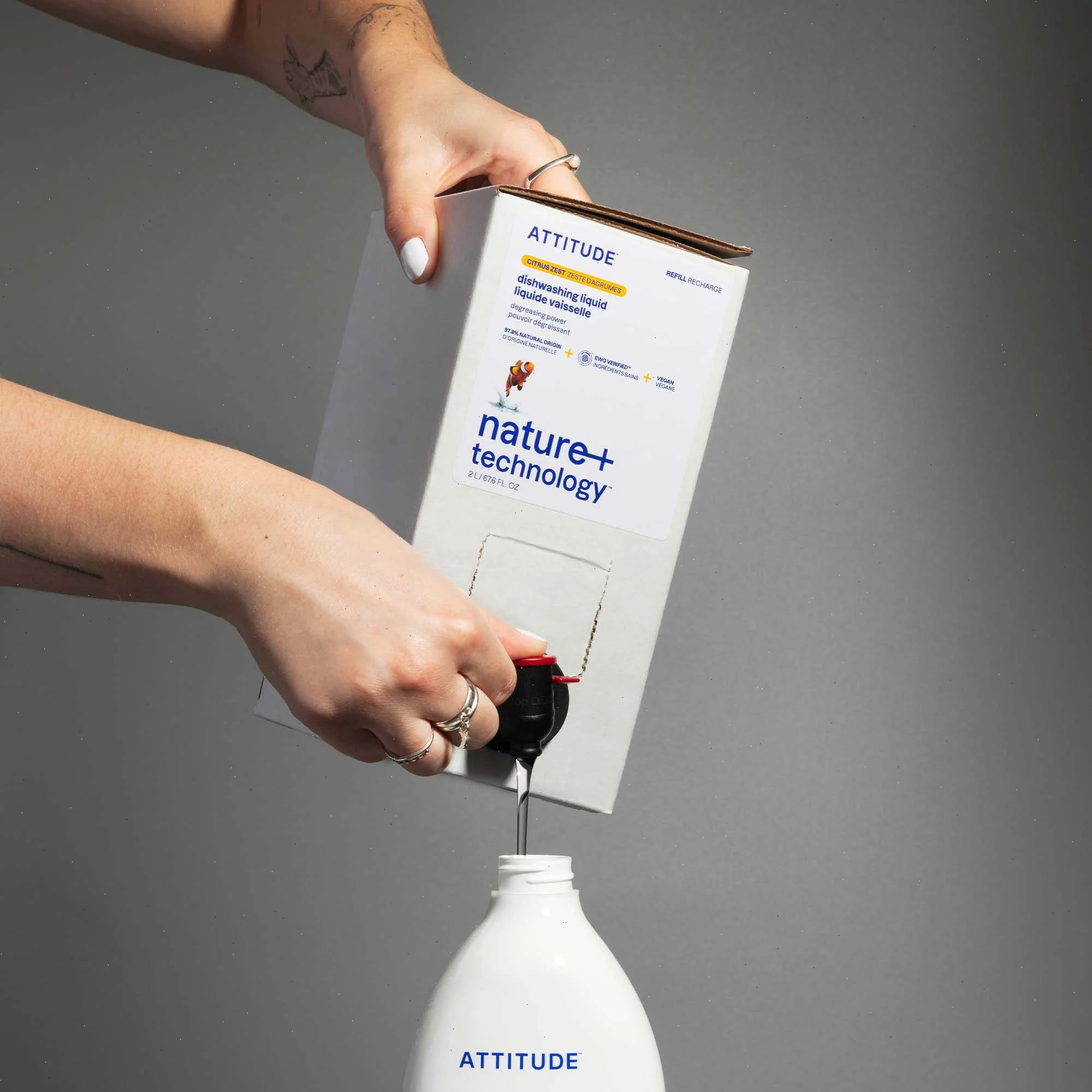 Formulated with 97% naturally derived ingredients, ATTITUDE™ dishwashing liquid with strong degreasing power is your new home essential. Its lively pink grapefruit notes blend harmoniously with the gentle floral tones of orange blossom. Its aromatic blend will give your kitchen a sunburst of energy. Its formula is completely vegan. This dishwashing liquid is offered in a 2 L eco-refill format that’s easy to carry and use at home.