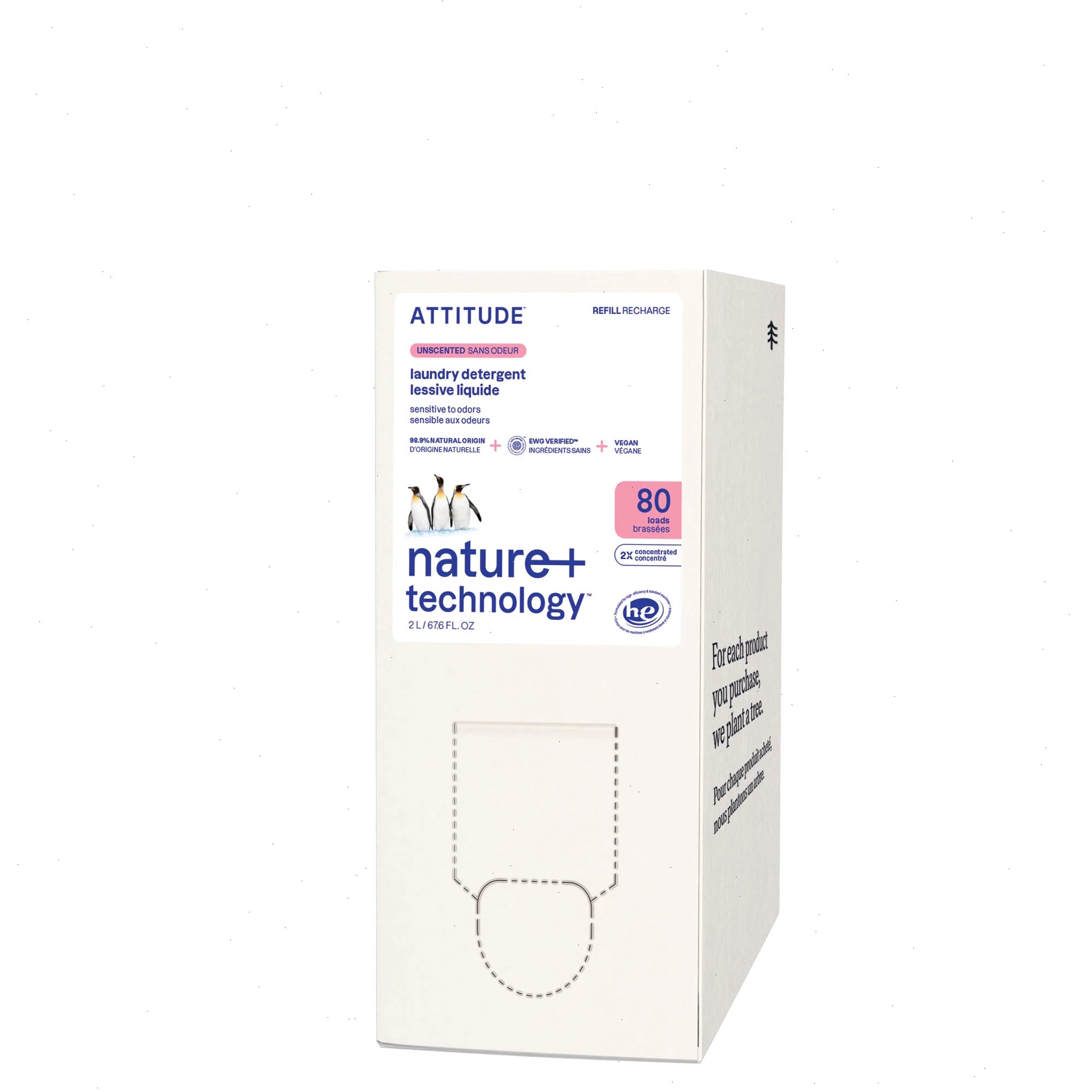 Formulated with 98% naturally derived ingredients, ATTITUDE™ laundry detergent packs excellent detergent power and is free of enzymes. A gentle, dermatologically tested and unscented detergent designed for delicate skin and fragrance sensitive. Its concentrated formula allows you to do more loads while using the same amount of detergent. Our laundry detergent is effective for cold water wash, saving you energy. Its vegan formula is certified by PETA and is offered in a 2 L eco-refill format that’s easy to carry and use at home.